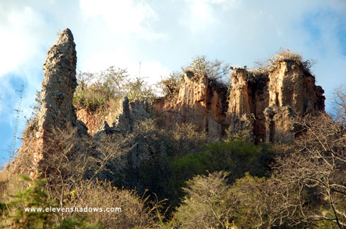 Earth pillars, Rumi Wilco Nature Reserve. Earth pillars are made of boulder clay, a chaotic jumble of rounded boulders, smaller rocks, pebbles, and sand. Earth pillars can be seen around the Vilcabamba area, and developed where small patches on hillside spurs were protected from rain erosion by a harder layer of rock or by dense vegetation. |