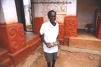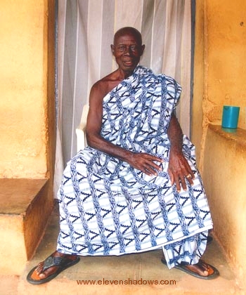 Kwabena Adade, the 96-year old storyteller of Adaku Jashi Shrine.The Ashanti Storyteller of Adaku Jashi Shrine Adaku Jashi (Adarko Jachie) I had a fantastic experience visiting Adaku Jashi Shrine, near the village of Ejisu, although not for the reason I that initially drew me here. I had come to see a flamboyant dreadlocked fetish priest who careened wildly about during ritual ceremonies. This sounded exciting!! However, when I stopped at a roadside vendor to purchase a libation to honor the priest, a young man told me that the elderly priest was no longer at the shrine. Although disappointed, I continued to the shrine, with the young man now accompanying me. This young man, Hon Osei Bonsu, turned out to be the councilman of Adaku Jashi, and at 25, is the youngest councilman in all of Ghana. The shrine was beautiful. I asked a few questions about its origins. The councilman said that a village elder knew the answers. We stopped at Agye Kwabena Adade’s home, who at 96 years of age was the oldest man in Adaku Jashi. He was happy to receive us and tell us the history of Adaku Jashi Shrine while munching on tea and biscuits. Incredibly, after he finished the fantastic tale of its origin, he said that I was the first foreigner to ever hear this story! I was flabbergasted since UNESCO had declared the nearby Besease Shrine a World Heritage Site and had visited Adaku Jashi and other shrines in the area, and at 96 years of age, he would have had plenty of opportunity to tell someone about this. “You haven’t told this story to even UNESCO or university researchers?” I asked. “If they had asked, I would have told them,” he replied. The councilman said that this was the first time he had heard the story as well. After hearing the tale, we both walked away smiling, feeling quite honored to have heard the history of Adaku Jashi Shrine! Agye Kwabena Adade said that I could share the story with other foreigners, and so below is the story, as translated from Ashanti by the councilman. |