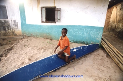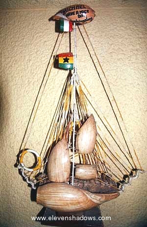 New Job as the Interior Decorator for the Savoy HotelAt St. George's Castle, I was approached by a boy named Michael. When I came out of the Castle, he had written From Michael, Have a nice day, To Ken on a seashell and gave it to me as a "gift", asking money afterwards. I tried to give him back the shell, but he refused, pointing out that he could not erase my name. So Michael's lovely gift now seamlessly adorns the very top of the shell boat sculpture at the Savoy Hotel, where I was staying in Cape Coast. |