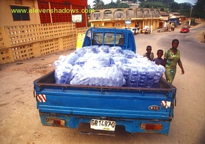 delivery truck with jillions of plastic bags of water. |