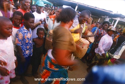 villagers danced and drummed downThe streets of Anomabu in anticipation of the Bontiku Festival, a religious festival. Some of the participants cleared a path so I could photograph the dancers more easily. |