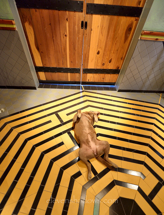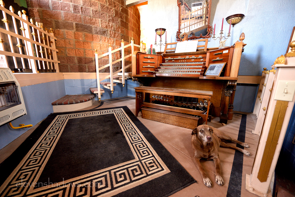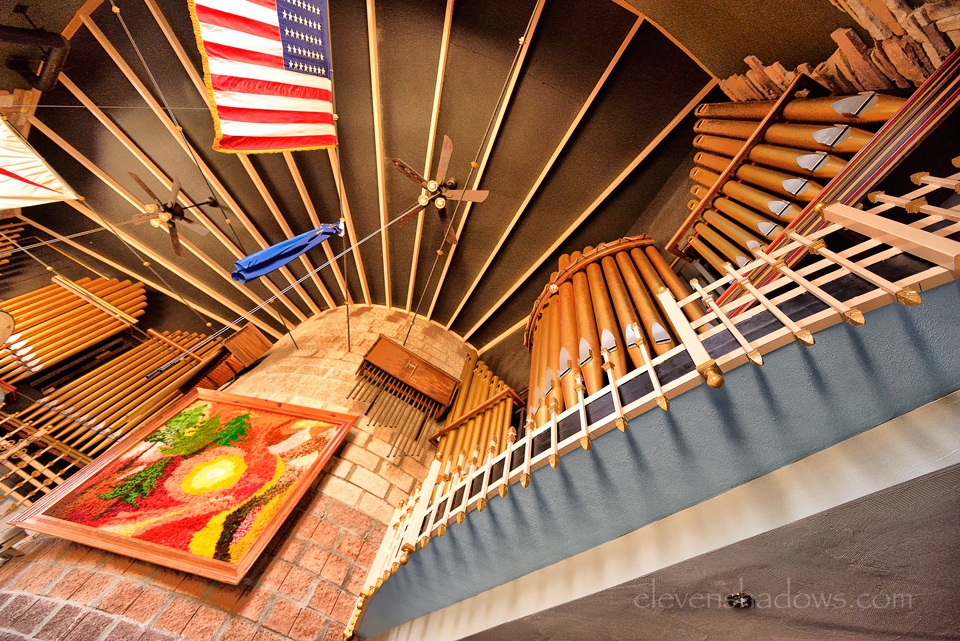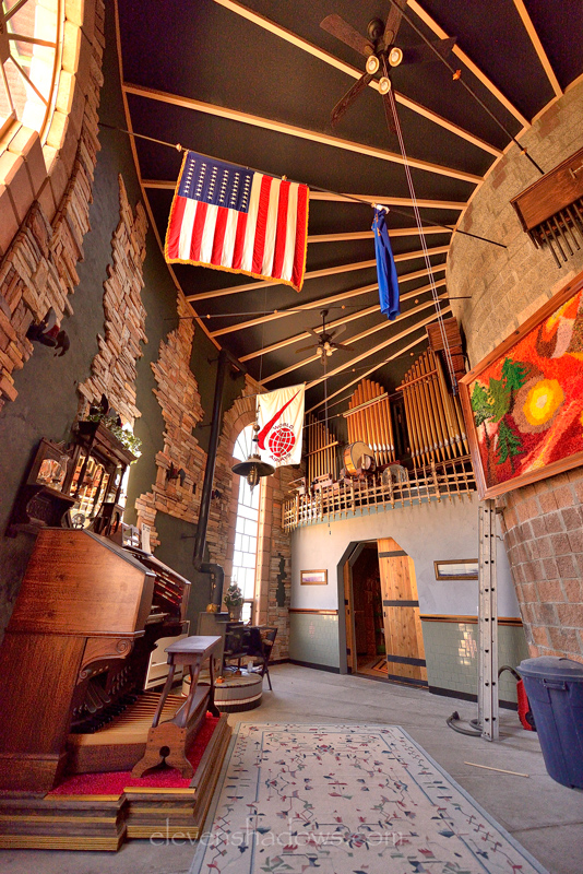 Looking up at the ceiling from the ground floor, where the two pipe organs are housed, in the Hard Luck Castle, built by Randy Johnston, a labor of love.