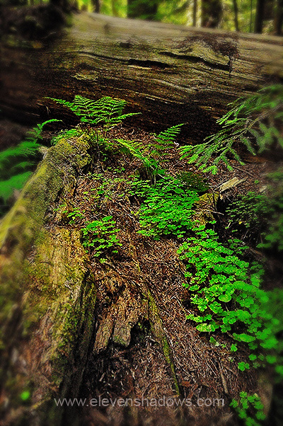 A fallen redwood trunk, such as this one in Founder's Grove, is home to many different species of plants and animals, occasionally including some humans, who have hollowed out a trunk to create a home. |
