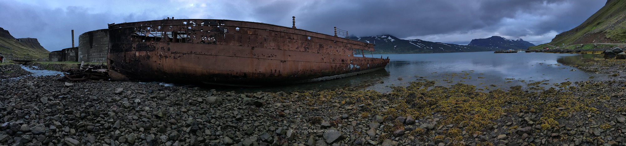16 June 2016, continued:Djupavik, one of my favorite places on the trip. This is a panorama iPhone photo taken in relatively low light with this amazing rusty ship set aground by the shore of the fjord and left to rot. |