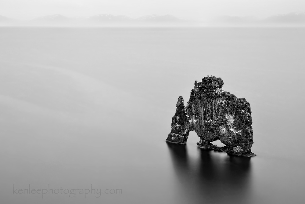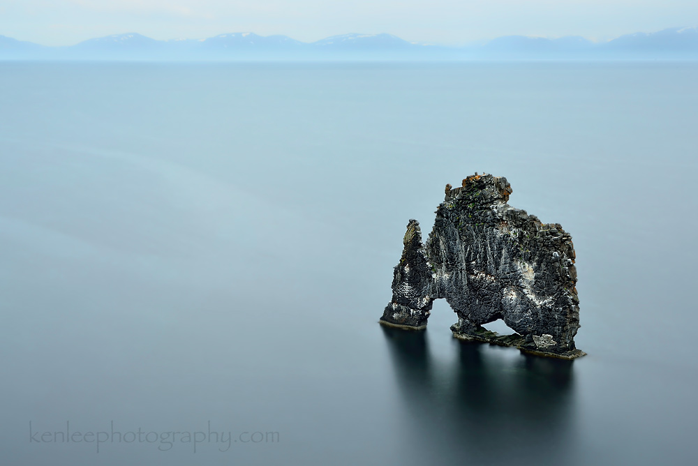 The Stone Sea Monster of Iceland (2016-06-18 19:01)For the first part of the trip, I traveled toward the west part of Iceland with a photographic group led by Lance Keimig. This unusual rock formation protruding from the sea is the remains of an ancient extinct volcano Hvitserkur on the sea shelf. Hvitserkur, which translates to "white shirt" and derives its name from being covered in Shag and Cormorant guano, rises 15 meters, or nearly 50 feet from the sea. Icelandic legend has it that the rock was a troll who forgot to retreat from the light and was turned to stone in the sunrise, though from some angles it is said to look like a dragon drinking from the water, while others say that it looks like a sea monster frozen in stone. I'm going with the frozen sea monster. The geological oddity was commemorated on an Icelandic stamp in 1990. Nikon D610/Nikkor 28-300mm. I took eight photos, each one at an eight-second exposure at f/22 ISO 100 and stacked eight of them together to create an even longer net exposure, this one 64 seconds in total to smooth out the water movements of the sea. |