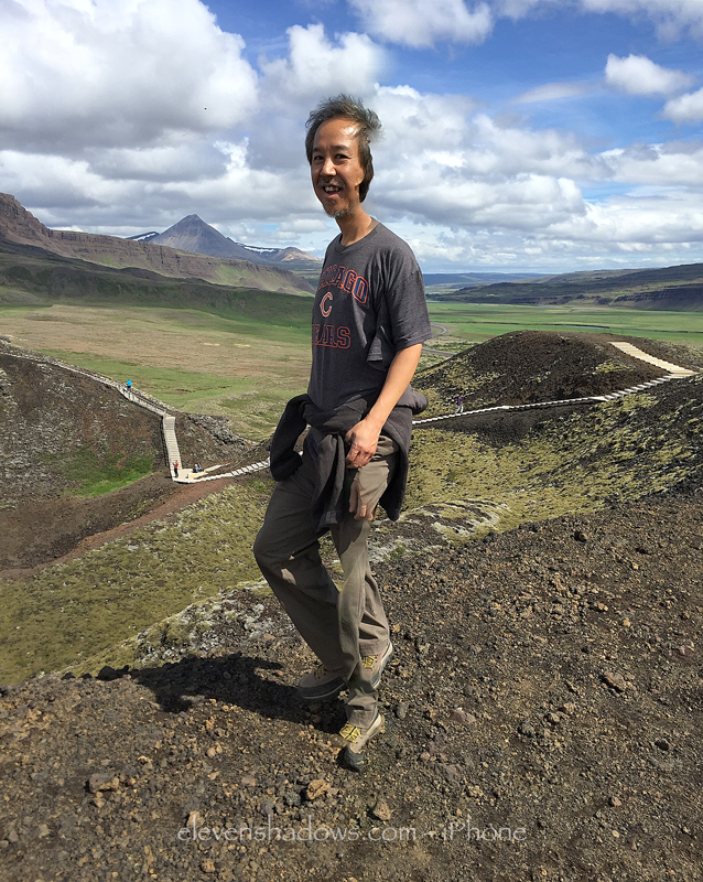 We stayed at this rather boring farmhouse that really wasn't a farmhouse. I can't remember where. But there was nothing to photograph, and I found myself feeling rather restless. I was, after all, on a photographic trip, but there really wasn't much that inspired me to photograph. The next morning, we left, making our way back to Reykjavik. I was rather sad about this. I was enjoying the trip, and wanted to stay in Westfjords. We would stop along numerous sites along the way. This is Grabrokargigar Crater, Iceland in this fun iPhone photo where I was moving while the photo was being taken, resulting in this bizarro version of me. |
