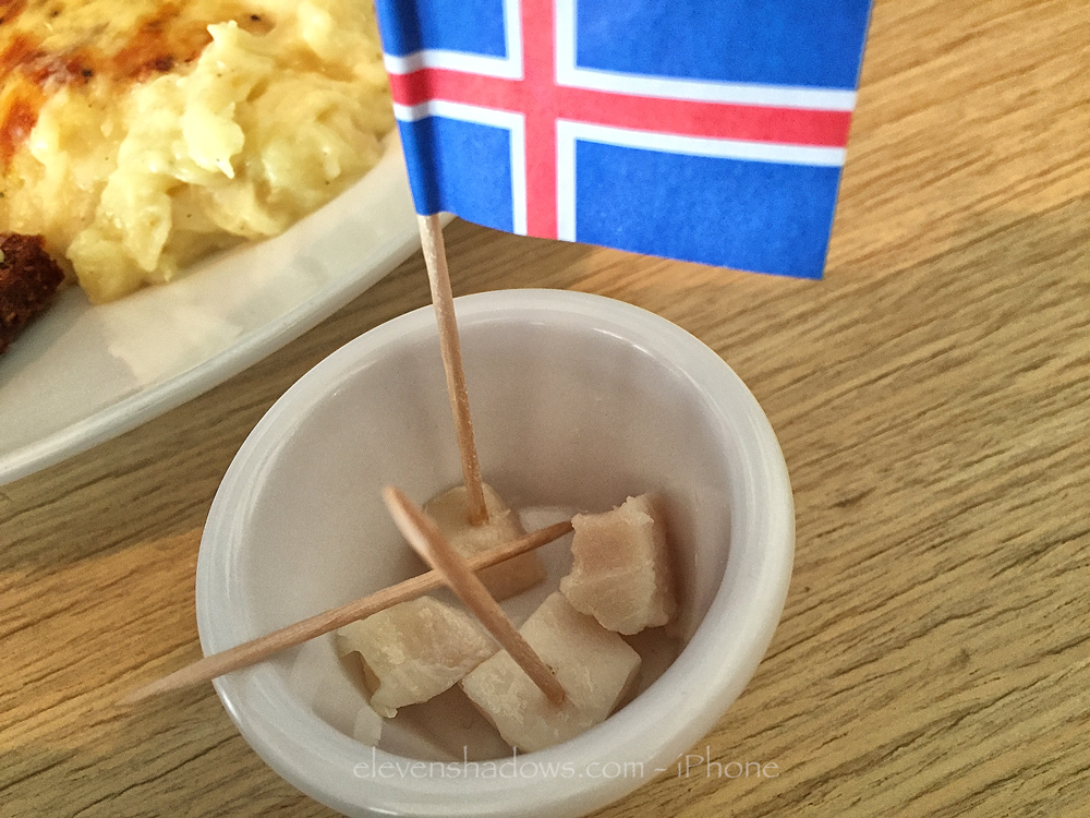 Here's how Wikipedia describes fermented shark: "Hákarl is traditionally prepared by gutting and beheading a Greenland or basking shark and placing it in a shallow hole dug in gravelly-sand, with the now-cleaned cavity resting on a slight hill. The shark is then covered with sand and gravel, and stones are then placed on top of the sand in order to press the shark. The fluids from the shark are in this way pressed out of the body. The shark ferments for 6–12 weeks depending on the season in this fashion. Mmmmmm. Yummy. So Tyler ordered some at Cafe Loki because, well, why not? It smelled horrible, absolutely disgusting. Surprisingly, it didn't taste that bad. So no, fermented shark is not the most vile, disgusting food on the face of the earth. Things like liver are still in the lead. iPhone photo.