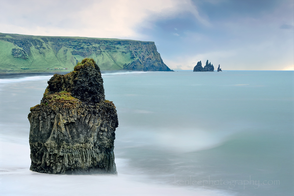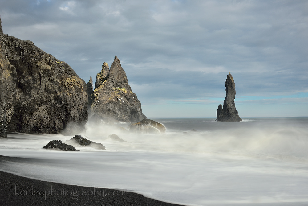 Black Sand Beach and Dragon's Teeth (2016-06-22 17:53)For the second part of the trip, I rented a Renault Clio and explored the more often-visited south part of Iceland. This was taken on the black sand beach near Vik. For some reason, my right knee, which I had surgery on, suddenly started hurting badly for no apparent reason while I was walking on the cold, windy beach. Was it the weather or all the mileage? Regardless, I kept on walking, albeit much slower, and suddenly, it stopped hurting. The black sand beach here reminded me a bit of Black Sands Beach in the Lost Coast of California...except for those amazing rock formations, including Dragon's Teeth in the distance. Nikon D610/Nikkor 28-300mm. This is 66 seconds in total, stacking 22 photos taken at 4s f/32 ISO 200 together to get more blurring from the movement of the water to create a surreal moody sort of smoothness in the ocean water. |