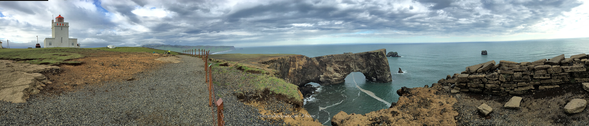 Dyrhólaey, south Iceland. Dyrhólaey is about 170 km from Reykjavík city, and very close to the small town of Vík (the southern most village in Iceland). Dyrhólaey is a small peninsula or promontory but was formerly an island of volcanic origin. Dyrhólaey got its name from the massive arch that the sea has eroded from the headland (the name literally means "door-hole"). iPhone panorama photo. |