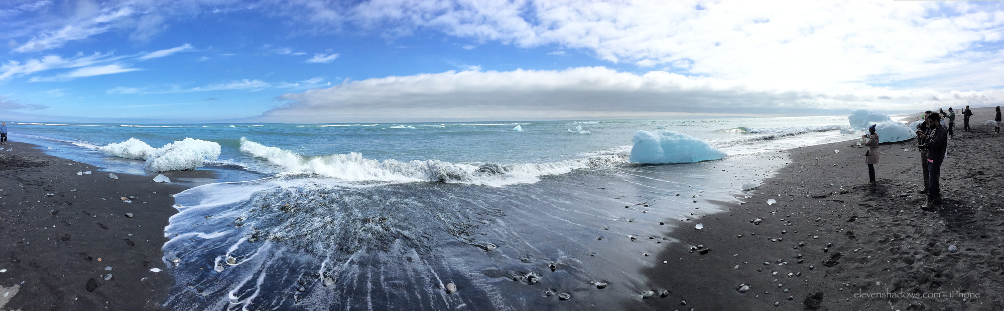 Black Sand Beach just south of the Glacial Lagoon, with its floating icebergs. iPhone panorama photo. |