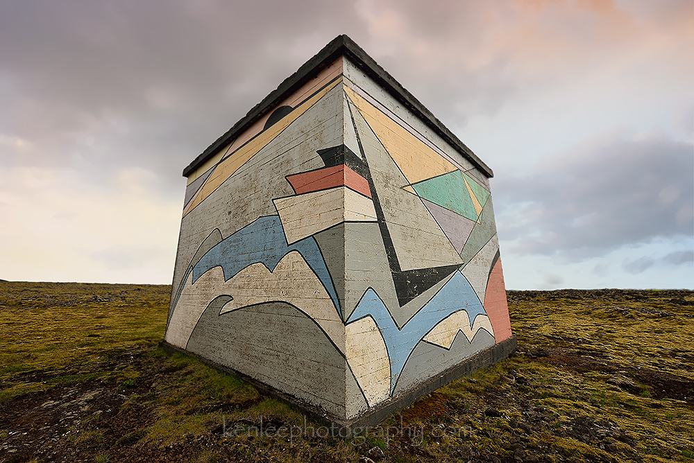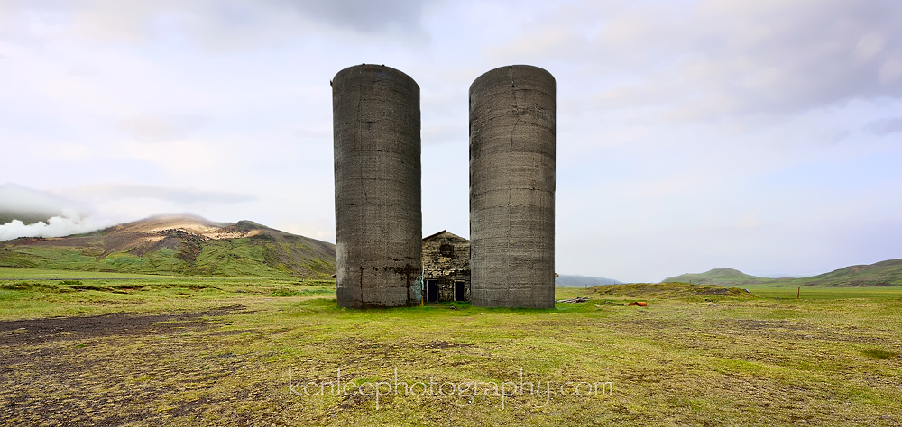An abandoned farm in Krysuvik, Reykjanes Peninsula, near Reykjavik. The storehouse is bracketed by two large silos. |