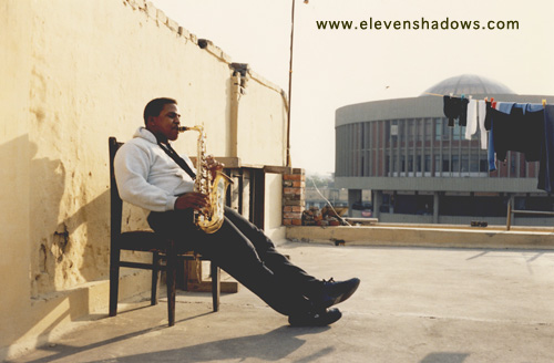 on top of his uncle Papu's apartment roof, with the Ramakrishna Temple in
