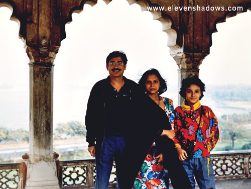 his wife Vena, and Smriti at the Agra fort, across the river from the Taj