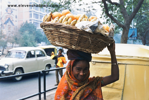 woman selling fruit by Janpath Market in New Delhi. India's fruit is