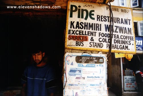 We took a road trip to the beautiful mountains of Pahalgam, or "Valley of the Shepherd" (yes, some think that this was named because Issa, or Jesus, stayed here). This fine restaurant serves up excellent food, tea, coffee.....and snakes?????