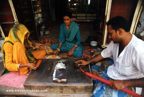 In the sides streets of Pushkar. A family making colorful bracelets from rolls of colored wax softened over a charcoal pit and then pressed on to a gold metal bracelet. |