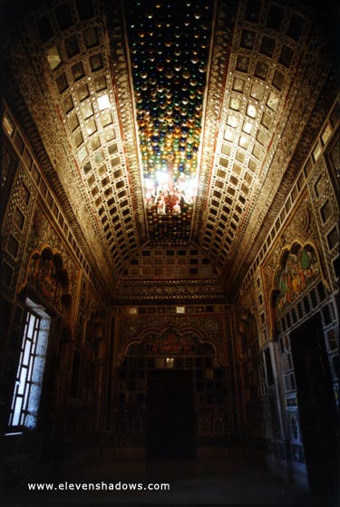 Sheesh Mahal, the Prayer Room in the Meherangarh Fort in Jodhpur. Note the Christmas ball sort of decorations on the ceiling. |