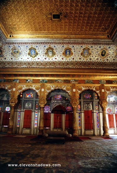 Phool Mahal (Flower Palace). Intricate artwork, paintings, stained glass, and over 80 kg (176 pounds) of gold plate at the Meherangarh Fort in Jodhpur. |