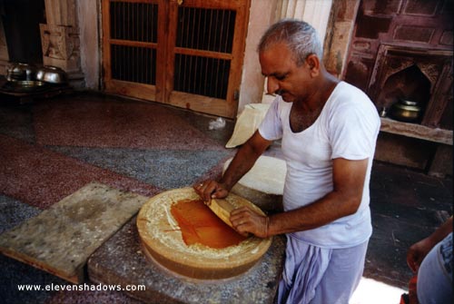 The Jain priest, Bhanu Prarkash Sharma, making sandalwood paste. He is an extremely friendly and knowledgeable man runs the temple, a school for impoverished students, a hostel, and camel safari trips. |