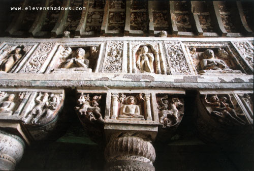 Detailed reliefs near the ceiling of one of the Ajanta Caves. |