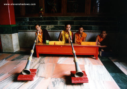 | Tibetan horns, Prayer Hall. |