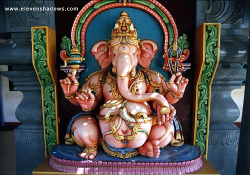 Ganesha statue in Palani, near the tram ride, carting happy pilgrims to the top of the dome-shaped hill where Malaikovil Temple is located, avoiding a walk up the 659 stone steps to the top (we walked up) Ganesha is the chubby, jolly, elephant-headed Hindu god that is held in great affection by Hindus. Ganesha is the Remover of Obstacles. |