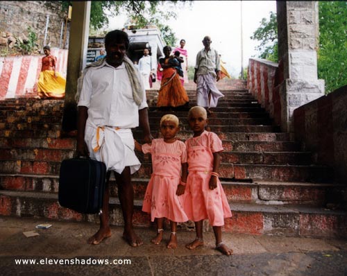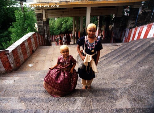 Shaved heads, sporting that cool sandalwood paste look. We met a lot of very friendly people climbing up the 659 stone steps to the top of Malaikovil Temple in Palani. |