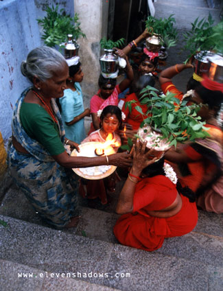 More sandalwood hairdos. For some reason, a lot of Hindu temples have red and white vertically striped walls. If you know why that is, please email me and let me know! |