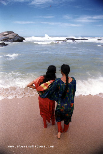 Two more pilgrims, looking at the holy waters of Kanniyakumari.