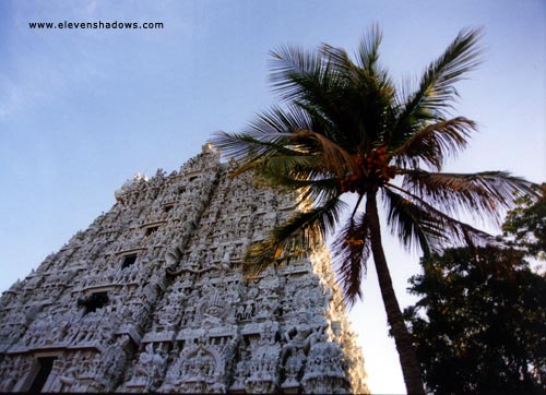 The Stanunatha Temple in the little village of Suchindram, 14 km north of Kanniyakumari. This is the tower above the main entrance, and is made of crushed seashells and milk! |
