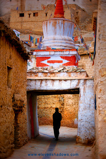 But old Leh, pictured here, looked much the same.Still jet-lagged and short of breath, I nevertheless took short walks, sometimes around the old town of Leh, just beyond the main bazaar, where kids played soccer in the alleyways, older people mumbled prayers, people got haircuts, and others went about their business. But as busy as they may have been, chortens such as this photo served as a reminder for their spirituality. |