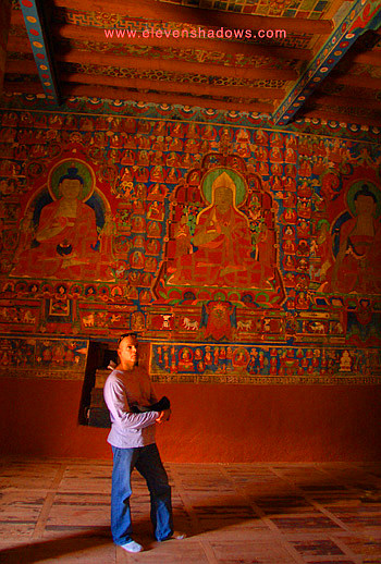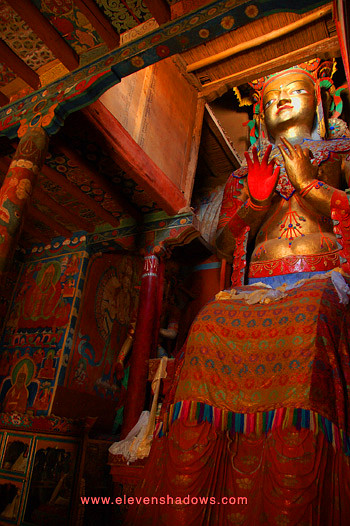 Gompa houses some fantastic frescoes and this enormous copper and gold