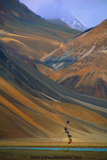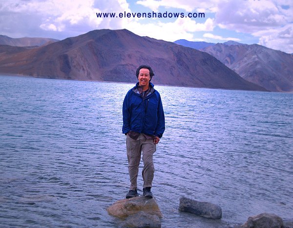 end an exciting, fun day.I slept soundly. It was extremely quiet in Tangtse. ~~~~ 10 July - In the morning, Delek and I left for Pangong Tso, a bit higher at 4300m (14104 ft). I had been at Pangong Tso, the world's highest salt-water lake, eleven years ago. But on that day back then, there had been no wind, and the lake was like glass, reflecting like a mirror. However, on this day, a cold wind whipped fiercely, and the day was rainy and cloudy. Still, though, the mountains were gorgeous, even as my ears grew cold while walking around the shores of the salt-water lake. |