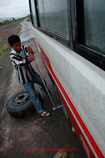 rougher road.And then.....BOOOM! What was that? The sound of a very large tire suddenly going flat. This took half an hour to fix. Trying to make lemonade out of lemons, I opened the window and stuck my camera out, photographing the changing of the tire, causing some laughter among several people. We eventually returned to Leh safely. The first thing I did was take a really long hot shower. The second thing I did was take my soaking wet muddy pants to the "lundry" man. The third thing was a delicious dinner at the Tibet Kitchen. |