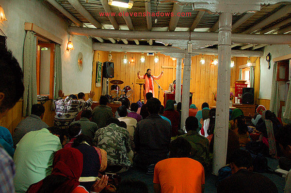 service in Leh.The Moravian Church was established here in the 1800s, and the church is still here today. I had previously met the pastor of the church a couple of weeks ago, inquiring about a diary telling about a Russian explorer who had allegedly discovered scrolls telling of Jesus coming to the Himalayas. "The diary disappeared 40 years ago, stolen, along with a great many other things," the pastor said. "I've been here 27 years, and haven't seen it." Numerous others had already inquired about it, and so I had already anticipated this answer. He invited me to take photos and attend a church service. And so I did. The insanely loud church bell rang, announcing that service was about to begin. Here, the church service was a Moravian mash-up delivered in Hindi, Ladakhi, Nepali, and English. Many of the people in attendance were from Nepal, singing and praying alongside Ladakhis, Indians, and the odd tourist. In the front was, curiously, a drum set and a Marshall combo amp, although neither was ever used. People removed their shoes and filtered in, sitting on the floor. The Moravians had translated Christian songs in Ladakhi, and sang them accompanied with an acoustic guitar, the voice and guitar both being fed through an ever-humming P.A. system. A young Indian man named Sadhu Nityananda (see photo above) told an often humorous story about how he became a Christian, constantly gesticulating wildly and peppering his lively speech with the occasional "Praise the Lord!" or "Thank you, Jesus!" |