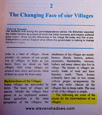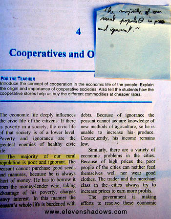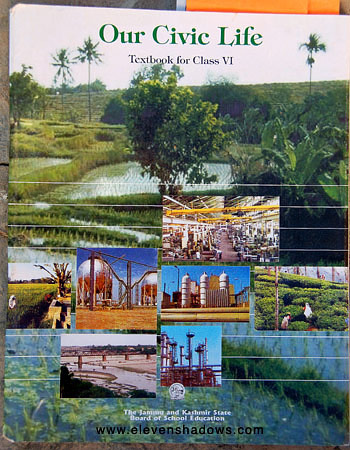 on the farm, becoming overworked.And the film also pointed out that while traditionally, Ladakh has always had surpluses of supplies and food, on government censuses, they would be considered well below poverty line. So with well-intentioned government subsidies, they had created a situation where Ladakhis needed money, and therefore, jobs. And as this wasn't happening, suddenly, real poverty and slums were occurring in Leh and elsewhere in Ladakh. ~~~~ This textbook, "Our Civic Life", issued by the Jammu and Kashmir state, has phrases such as: "The following are some of the causes for the backwardness of our villages". |