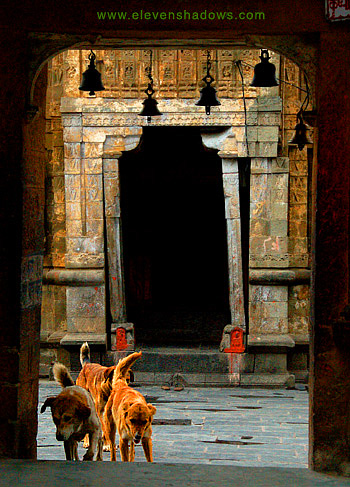 the name of, so it's difficult to say.I visited Champavati Temple next, a quick walk behind the police station. I walked into the back temple, and in its dark recesses, almost immediately stepped in crap. As I wiped it from my shoe, three little boys came, showing me Sui Mata's temple and at first seemed helpful. But then, the smallest one, probably five years old, threw a pebble at me. I was taken aback, not only at his age but that he was doing this on sacred ground. I reprimanded him, pointing to the temple. A minute later, another one threw a thick stick at me. I pretended to give chase, and two of them scattered, the oldest one remaining because he had thrown nothing. I left, deciding to walk around the Chowgan, as the sky was clearing and the mountains looked beautiful. |