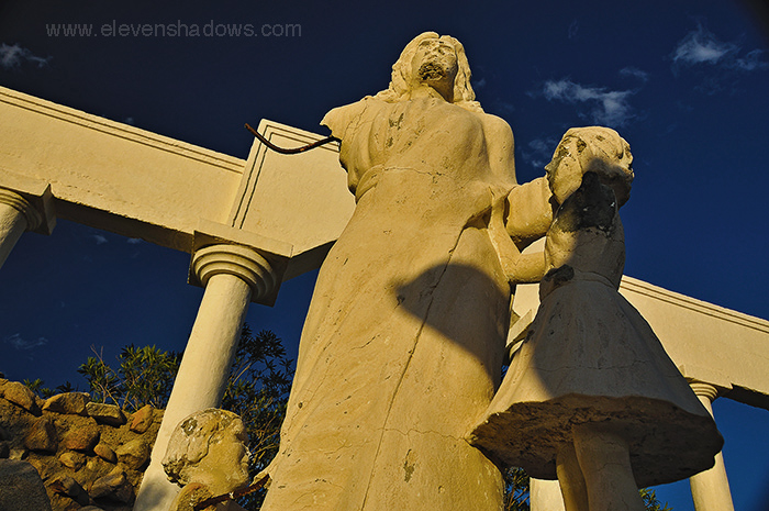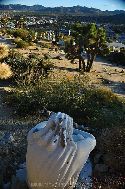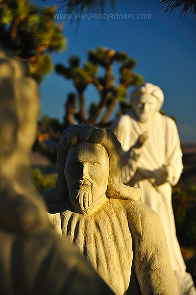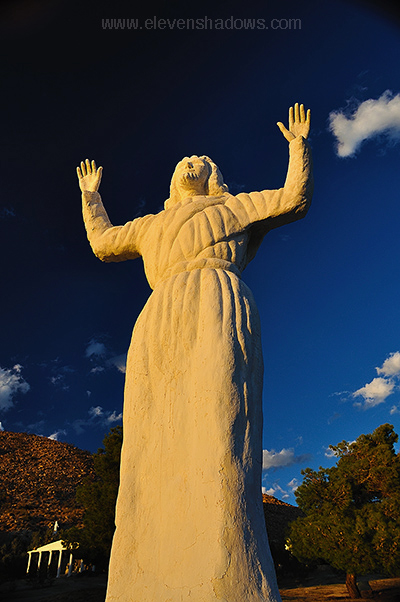 steel-reinforced concrete, hand-finished with a white paint/plaster mixture.Unfortunately, as I was enjoying the golden hues of the sunset, the sun hid behind some clouds. I patiently waited, camera in hand, for a break in the clouds so I could get this golden hue on the statue. The sun peaked out again for about ten seconds, and I managed to get this last shot of the Jesus statue. I realized I was starving. No matter. I had some homemade pizza from the night before, which I devoured in the Evangelical Church parking lot before driving back down the hill and up the 247 toward Landers...and the mysterious Integratron.