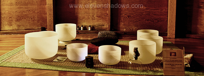 formerly sacred to the Native Americans who lived in the area.~~~ The photo is of quartz bowls, specially created for the Integratron, which are played for the sound bath. New owners now operate the Integratron, and expose people to the harmonic frequencies of the bowls being played during a sound bath. The unique acoustical properties of the domed Integratron - their website claims "it is the only all-wood, acoustically perfect sound chamber in the U.S." - created a beautiful experience for us, as we laid on the comfortable padding and blankets and absorbed the sound. The quartz bowls are played in a similar manner to how one would play Tibetan singing bowls. I laid near the bowls. However, because of the acoustical properties of the dome, the bowls sounded like they were emanating from everywhere, not simply next to where I was laying. The frequency beating of the various bowls was extremely pronounced. The person said to fill yourself with gratitude. Thinking this was a good idea, I did just that, and to my surprise, I stayed with it for most of the time. Toward the end, much of what I was grateful for unfolded quickly, often in unexpected ways, continually unfolding without me having to really focus as much on the feeling of gratitude. All in all, the sound bath seemed to pass quickly. I could not tell if my cell tissue was rejuvenated, but I thoroughly enjoyed the whole sound bath experience. |
