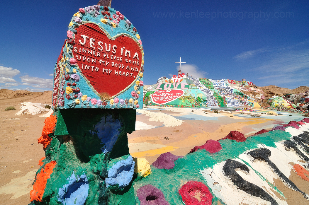 The "Toxic Nightmare": Saving Salvation Mountain In summer 1994, the county hired a toxic waste specialist to test for "contaminants." Even before the test results were back, they cordoned off the area and labeled it a "toxic nightmare." The tests predictably came back claiming high amounts of lead in the soil. The county petitioned the state of California for funds to tear down the mountain and haul it to a toxic waste disposal site in Nevada, a state that seems to be rather good at this sort of thing. However, local residents collected hundreds and hundreds of signatures were collected on circulated petitions. Thanks to the help of many old and new found friends, Leonard dug soil samples from the very same holes as the toxic waste specialist had dug, submitting it to an independent lab. The new tests revealed no unacceptable levels of any contaminants, including lead. Salvation Mountain was saved. Just a few year later, in 2002, Salvation Mountain was entered into the Congressional Record proclaiming it as a national treasure. Mr. Knight hopes that someday the museum will hold photos and artifacts of the mountain, including his struggle with the county supervisors, as well as his art. But more than that, he hopes that his message of love and compassion for all will be seen by more.