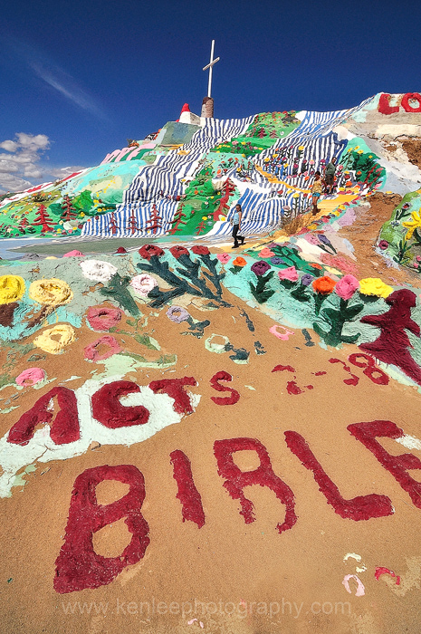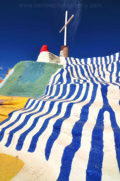 Mr. Knight rebuilt his mountain using adobe mixed with straw to hold strengthen the mountain, slapping liberal amounts of paint to combat erosion from the wind and rain. People come from all over with donations of paint. He uses it very liberally. Mr. Knight estimates that he has put over 100,000 gallons of paint on his mountain. |