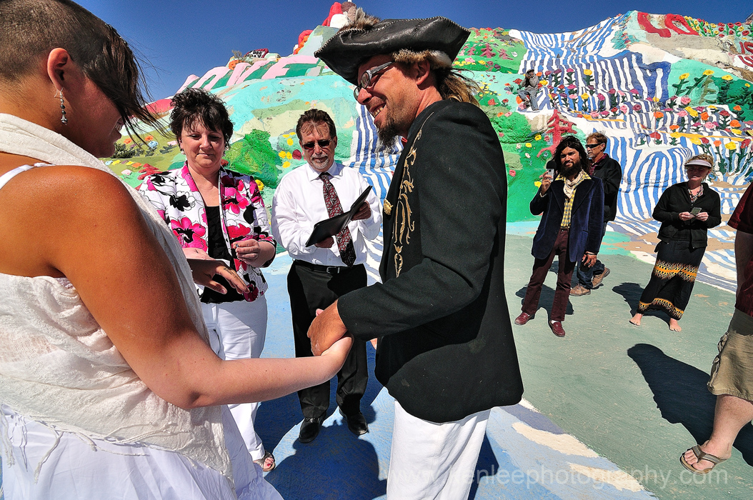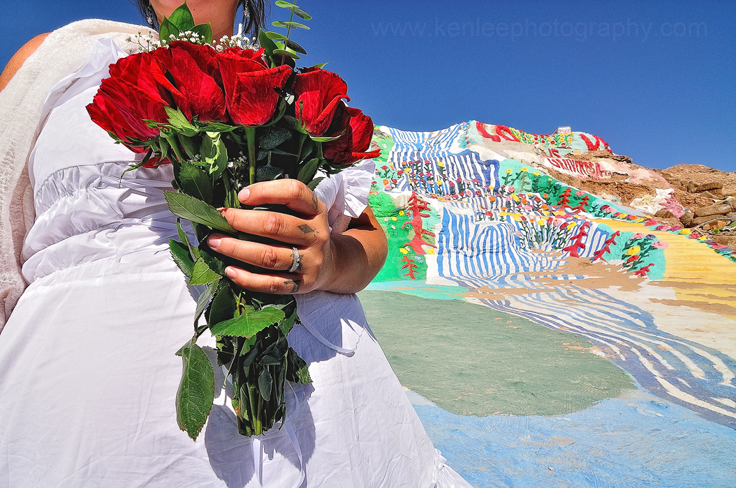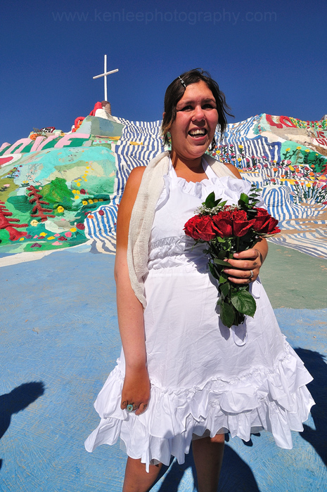 Moments after the vows were exchanged, Sara the newlywed smiles with Leonard Knight's Salvation Mountain as the backdrop. |