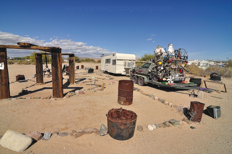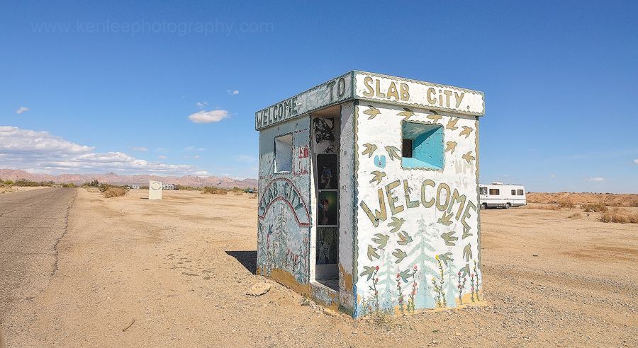 The colorful Salvation Mountain, which welcomes you to Slab City, can easily be seen from Beale Street, which you take from the tiny town of Niland. Slab City is "the last free place in America", as the sign says, and is a combination of local squatters and seasonal folk escaping the cold weather of the north, living by the old concrete slabs of the barracks of the abandoned and dismantled Fort Dunlap World War II Marine training base. In the years since the base was decommissioned, people seeking escape from "regular" society have flocked here, as many as a thousand coming during the winter months, attracted by DIY, rent-free living beyond the reach of electricity, running water and the law. It reminded me a bit of "Mad Max". Slab City, Here We Come: Living Life Off the Grid in California's Badlands (Time Magazine article)