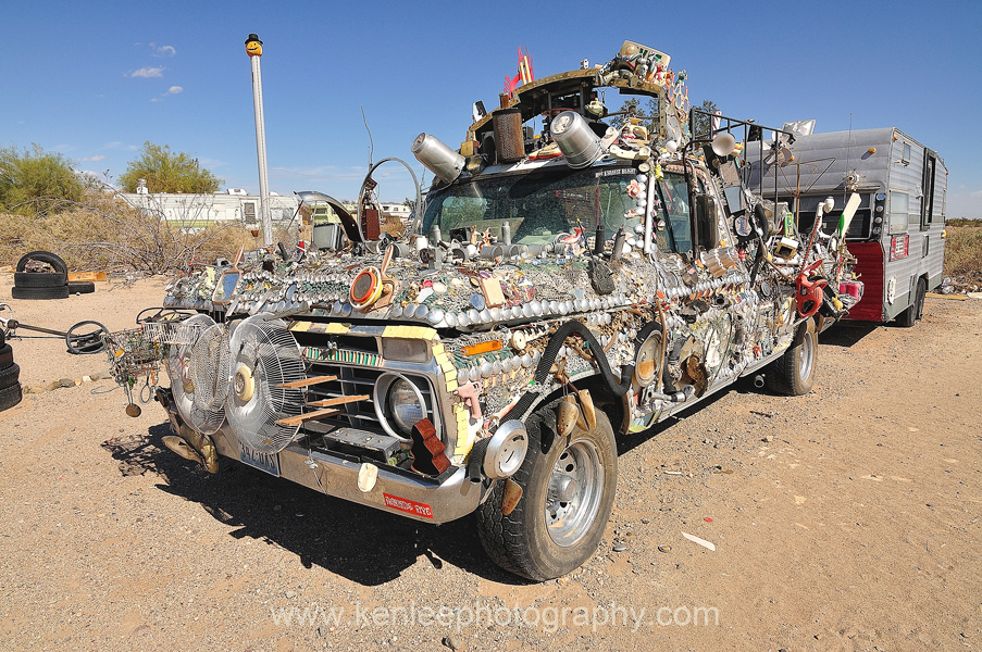 We briefly drove to Slab City, our attention immediately on this fantastic looking truck as well as the pillar with the pumpkin in the distance. |