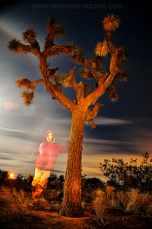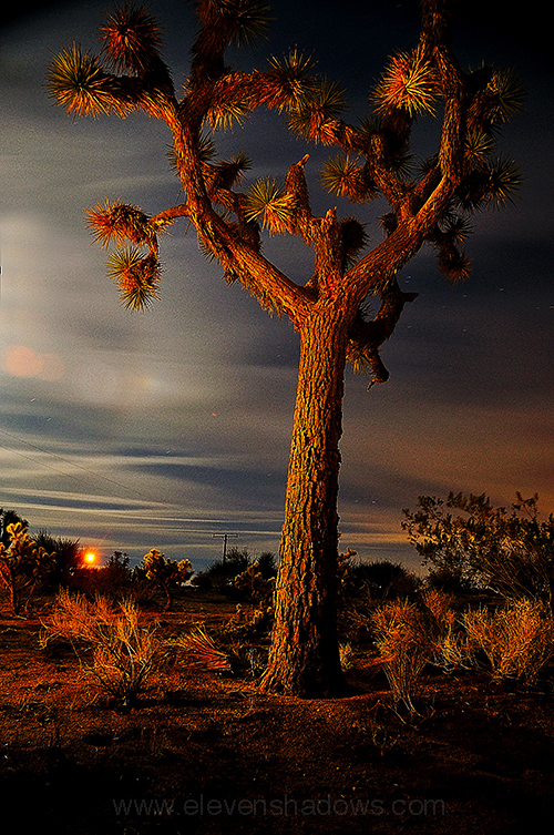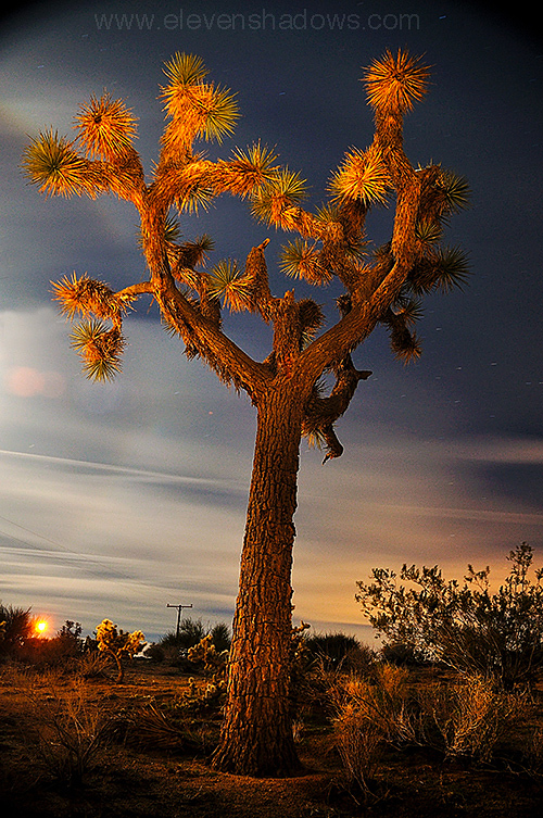 Joshua Tree "painted" only from the left side.Information on the light-painted Joshua Tree photos: Nikon D90, 18-200mm Nikkor VR lens on my Dad's 1970s Sears metal tripod. 116 second exposure, f3.5, 200 ISO, both taken between 11:45pm and midnight during either a full moon or darn near it. Lisa does not appear in any of these Feb JT photos at the request of her agent. |