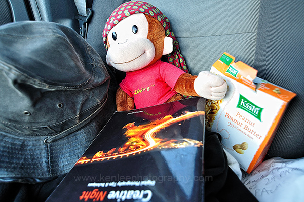 Lisa was sick and couldn't go with me, and she wouldn't have wanted to sit around in the desert watching my camera click and whir while taking long exposure photographs, I suspect. But George came along for the ride, reading excerpts from "Creative Night: Digital Photography Tips and Techniques" by Harold Davis while sitting next to my Indiana Jones hat and eating my peanut butter bars.