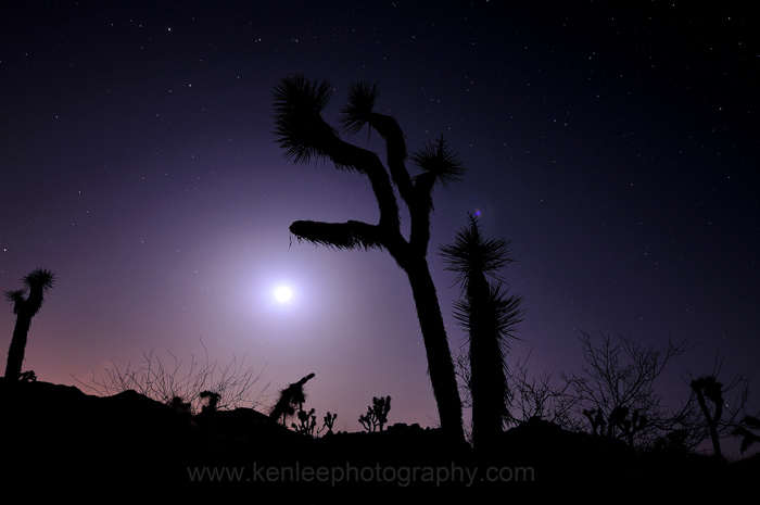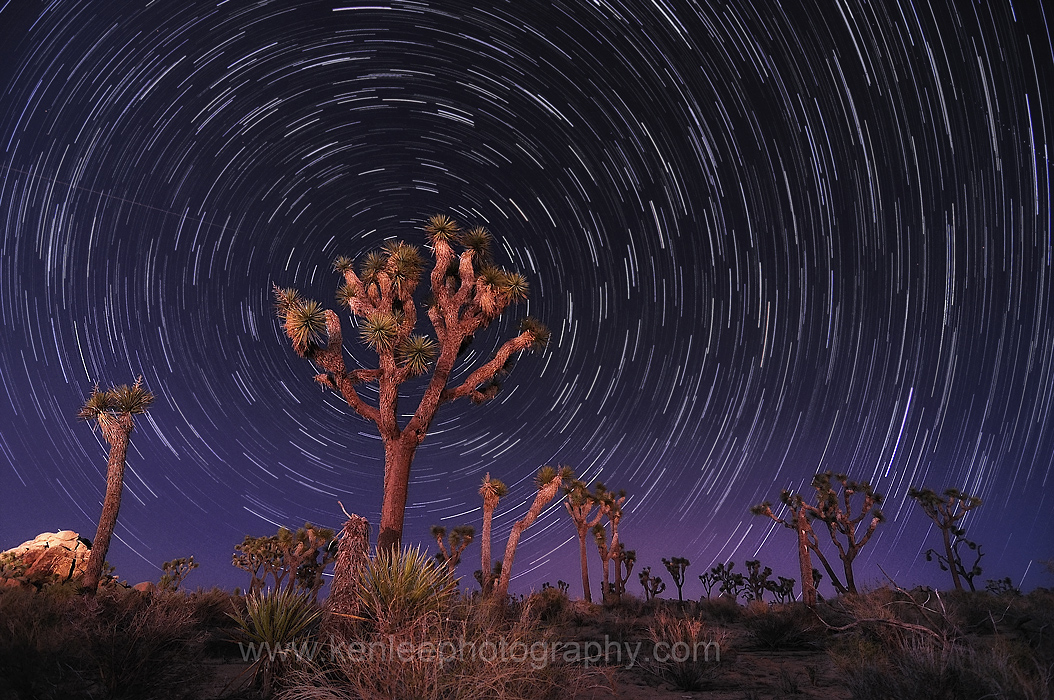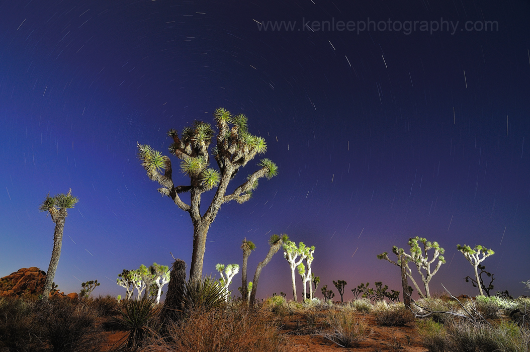 Geek stuff: Nikon D90, Tokina 11-16mm wide-angle lens, manual focus. Each of the eighty photos was f/4, ISO 800, for 30 seconds each. I did not have an intervalometer, so I simply locked the remote shutter release down for 40 minutes, setting the camera's manual settings for 30 seconds. The joshua trees were light painted by a couple of passing cars' headlights. Taken at Joshua Tree National Park near the Boy Scout Trail. If you look at the Extra Page, I have one of the eighty photos that were stacked so you can get a peep behind the magic curtain.