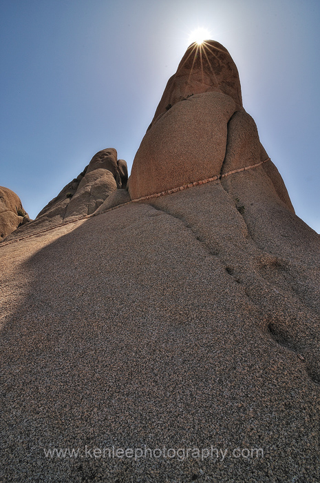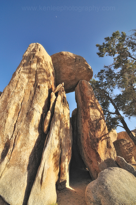The color version of the photo from the previous page, Hidden Valley, Joshua Tree National Park in the high California desert, United States. I love the balancing rock at the top. The tiny little white sliver near the top of the photo is the moon. I felt the black and white version was more drama and potency. |