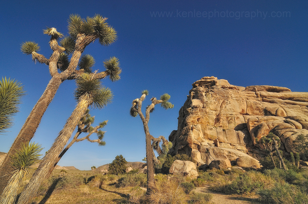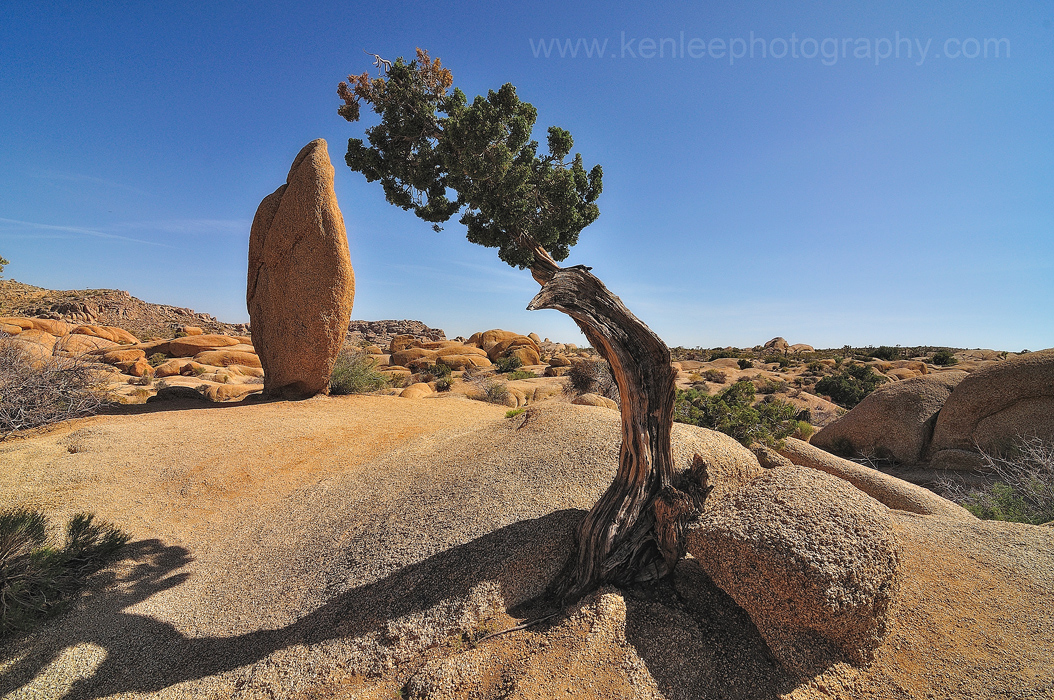 The color version of the photo from the previous page, Jumbo Rocks, Joshua Tree National Park in the high California desert, United States. Of all the versions that I ultimately decided to go black and white, this is the one I agonized over most. This looks about equally good in color as it does in black and white, but the black and white version had a little more emotion to me, so I went with it. Regardless, I love the rock in the background and the tree, and used a small aperture to make sure both were in focus. |