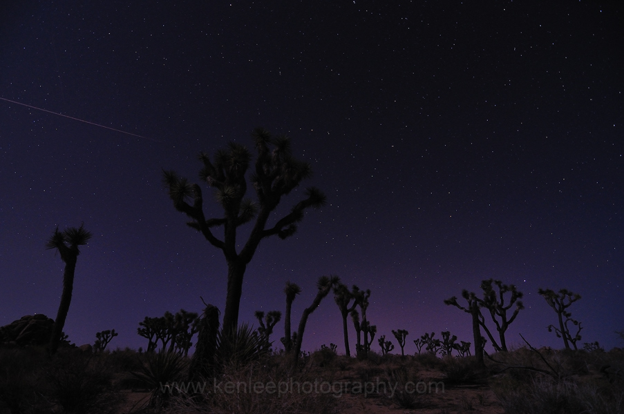 Why would anyone go through so much trouble to stack photos? Noise is the enemy of night photography. Keeping your shutter open for long periods of time is more likely to introduce noise. Stacking photos was originally developed as a technique in digital astrophotography to reduce noise, but of course, as more artistic photographers can use this technique too. The final photo, all together, is a 40-minute exposure. If I had left the camera open for 40 minutes, I would have gotten a lot of noise (grain), and the sensor would have heated up, coloring the stars. With my Nikon D90, I find that if I begin approaching 20 or 30 minutes, I begin getting more artifacts, and would have gotten more so since it was a relatively warm night. The red line on the left side is an airplane. In the final photo, I chose to leave it in because I thought it added some character. Since I had 80 photos, I could have easily taken it out. The foreground in a couple of other photos had the foreground illuminated. I liked that. In fact, that's why I had set up here. So I left them in, using Photoshop to blend the amount of illumination in to my liking. I like having that sort of artistic control, which is why I used Photoshop to stack the photos instead of one of the freeware versions that don't appear to offer as much control.